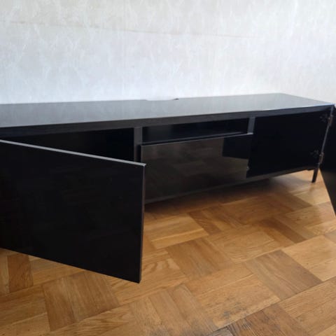 Tv-bänk bestå ifrån Ikea i vit med luckor i ekfaner, kan vara väggmonterad eller stå på ben som på de egna bilderna.