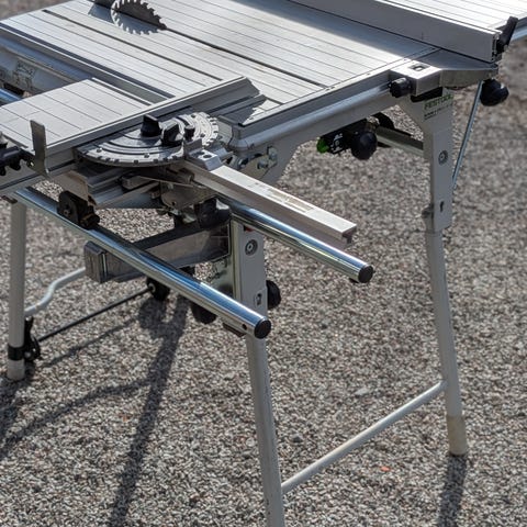 DeWalt DW742 kombinerad bordsåg och kap- och geringssåg med stativ. Stabilt gult stålchassi, aluminiumbord och justerbara anhåll för olika kapningar.