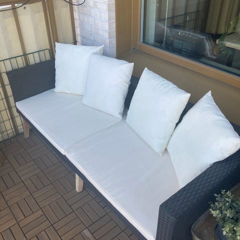 Modulsoffa för uteplats/balkong med tre sittdelar och gråa dynor.