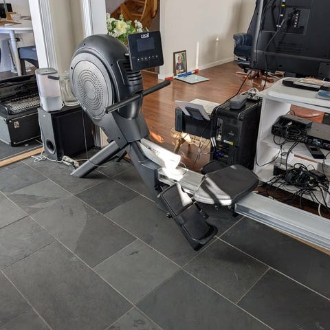 Roddmaskin med stor svänghjulssida och fotplattor med remmar. Har sits på skena och enkel ratt för motståndsinställning framtill.