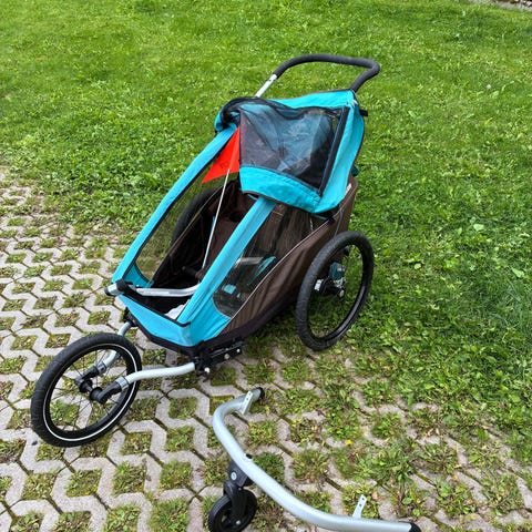 Säljer vår Croozer cykelvagn för två barn.