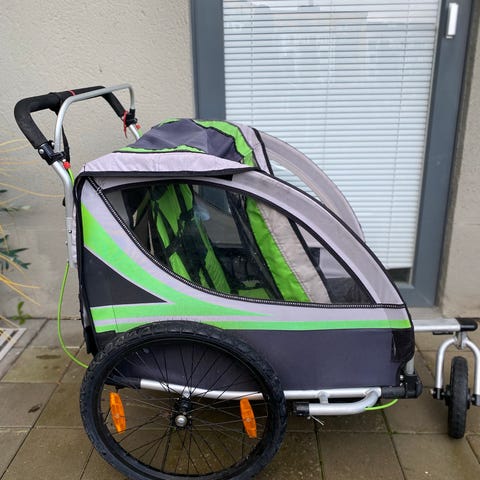 Cycletrack cykelvagn i gul/svart med plats för två barn och säkerhetsbälten. Stora hjul, nätfönster på sidorna och dragkedja bak för enkel öppning.