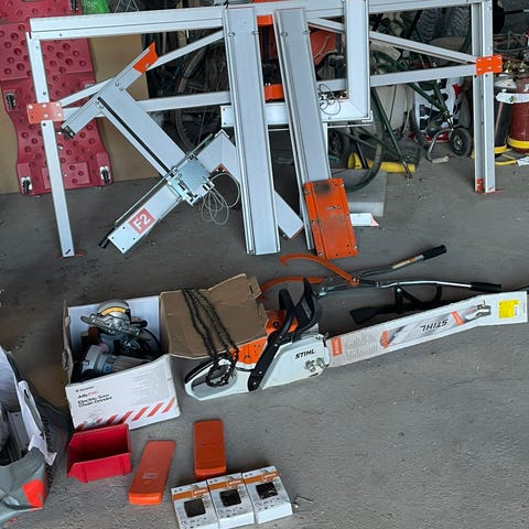 Logosol kedjesågverk med lång skena och aluminiumprofiler säljes. Kedjesågen sitter monterad i ställning med handtag och fästen, Stihl 660 36 " svärd Kanske 6 timmar gångtid