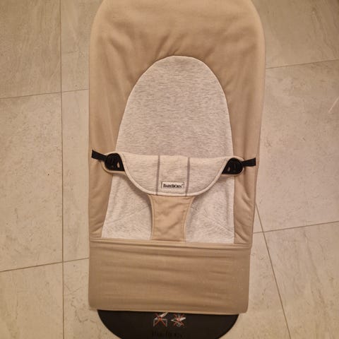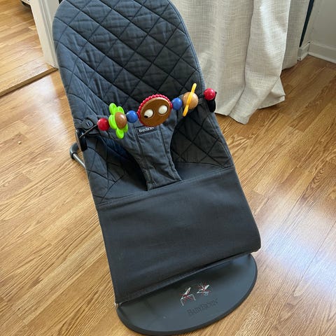Babysitter från Babybjörn i svart med nät-tyg och grå insida. Leksaksbåge med färgglada figurer framtill ingår på köpet.