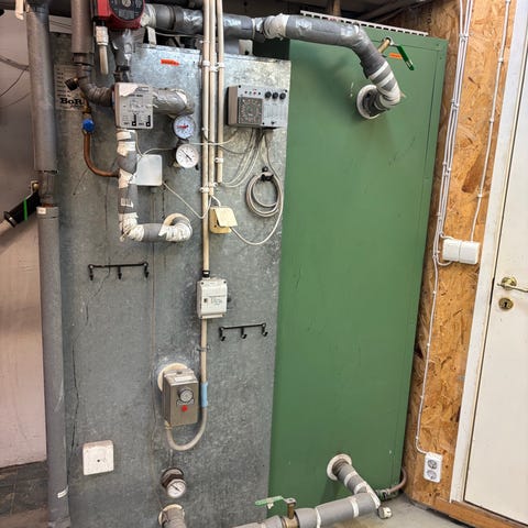 3 st Borö VP-500L A ackumulatortank med flera anslutningar fram, Ena tanken har fått sig en smäll men det påverkar inte funktionen. Rött expansionskärl på 150L med toppanslutning följer samma system och har också märkplåt upptill.