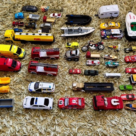 Hot Wheels slot car bilbana med orangea rälsdelar och två bilar. Två handkontroller och delar till raksträckor och kurvor följer med i insatsen som på bilden. (Inte använd sedan ett tag så jag vet inte om den fungerar eller inte.)