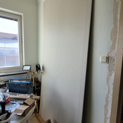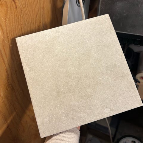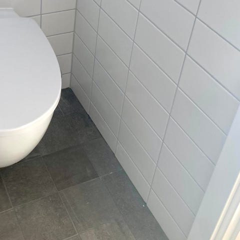 Ljusgråa klinkerplattor överblivna från tillbyggnad.