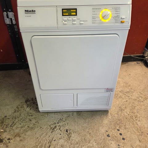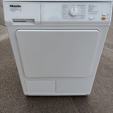 Miele frånluftstumlare T 354 i vitt med enkel panel och vred för programval. Trumman är i rostfritt och luckan öppnas åt vänster med rejält handtag.