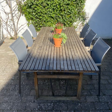 BRAFAB EXCLUSIVE Trädgårdsgrupp i trä med ovalt bord och 6 stolar med ribbade ryggstöd. 4 st stolar med armstöd och 2 st utan armstöd det finns dynor till sittplatserna