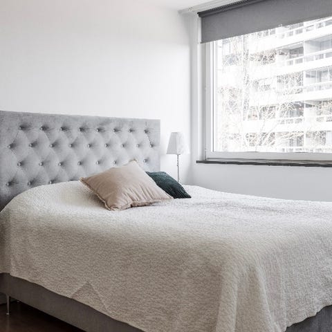 Sänggavel från IKEA med överdrag i benvit bouclé från Ellos Home.