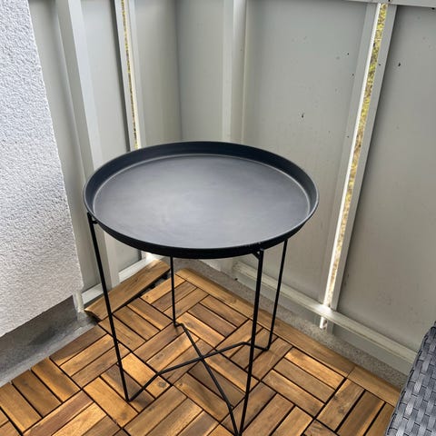 Svart brickbord/piedstal på hög metallställning, bra som litet sidobord eller till växter. Rund bricka upptill och smal benställning som tar liten plats.