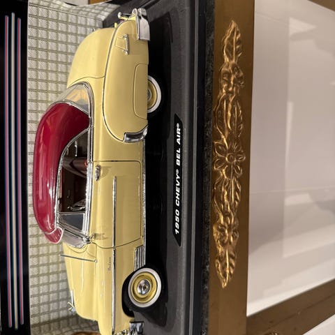 Orange modellbil av en amerikansk klassisk bil med kromdetaljer och tonade rutor.