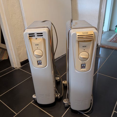 Vitt oljefyllt element från Adax med vred för temperatur och lägen på framsidan. Har kabel med stickkontakt och hjul undertill så det är lätt att flytta runt.