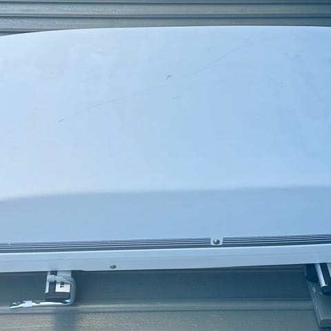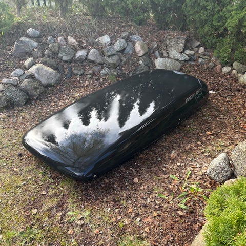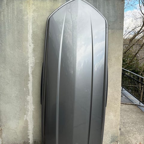Volvo takbox i svart monterad på takräcke. Öppnas från sidan och har låg, avlång profil som passar bra på kombi och suv.