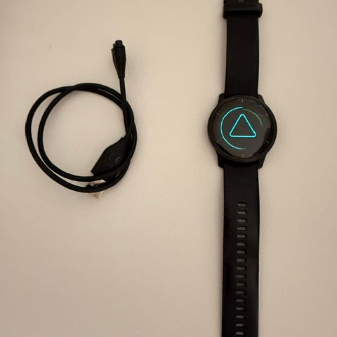 Garmin Venu 3S smartklocka med ljus rem och mörk urtavla. Levereras i originalkartong med laddkabel och manual synliga på bilden.