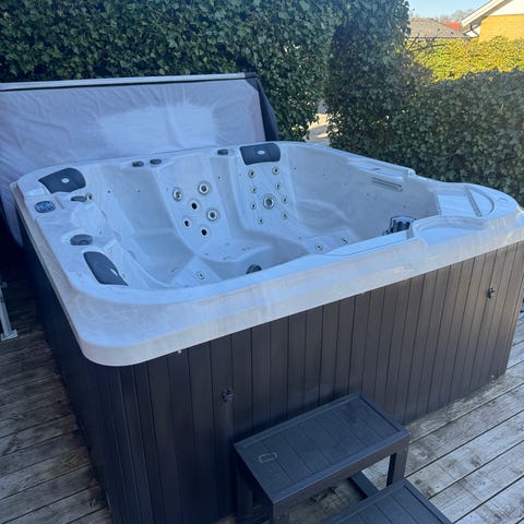 Stort spabad för uteplats med mörk insida och ljus panel runt om. Många massagejets, ligg- och sittplatser samt inbyggda mugghållare och lättåtkomlig teknikdel på sidan. 3 sittplatser + 2 liggplatser. Men upp till 7 personer. Dock har den frusit under vintern. Troligtvis är det att byta pump och en koppling. Gissar på att det kostar ca 5-10 000kr att laga den. Allt annat är toppskick . Poolen är ca 3 år gammal. Och lock ingår. Hämtas av köparen. Nypris 75 000kr