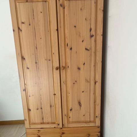 Fin och robust garderob i ljus träfanér. Rymmer mycket kläder på galge samt lådor. Finns på Södermalm nära Mariatorget.