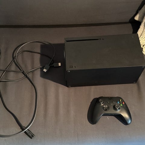 Xbox Series X svart spelkonsol från Microsoft. Snygg stående modell med skivläsare på framsidan. Då den inte andvänds längre så säljes den. Endast konsolen och kabel ingen handkontroll