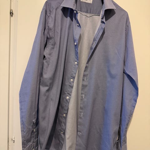 Skjorta med lång ärm och krage. Försluts med knappar framtill och har knappar vid ärmsluten. Diskret mönster över hela tyget.