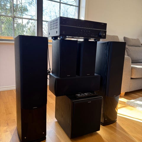 Säljer ett mycket kraftfullt och välspelande 5.1-system som passar perfekt för både film och musik. Systemet består av Yamahas exklusiva Aventage-serie receiver och Audio Pros populära Wigo-serie. Allt är i mycket gott skick och fungerar felfritt.
