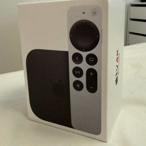 Apple fjärrkontroll med touchyta och knappar för meny, volym och uppspelning. Baksida i metall med Apple-logga.