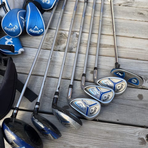 Wilson golfklubbor med matchande blå/svart bag, flera järn och woods. Bagen har bärrem och flera fack på sidorna för förvaring. Setet är i väldigt bra skick. Klubbor som ingår. 3 och 5 wood. Hybrid 5 järn 6-9, pw, sw och putter!