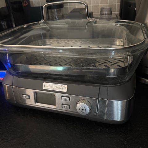 Ångkokare från Cuisinart med glaslock och digital display framtill. Har kontrollknappar på framsidan och insatsgaller för maten.