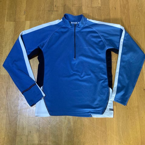 Träningströja från Craft till vuxen herr av modell lager 2 i fuktavvisande material i storlek small i svart och blå färg. Kort dragkedja i halsen.