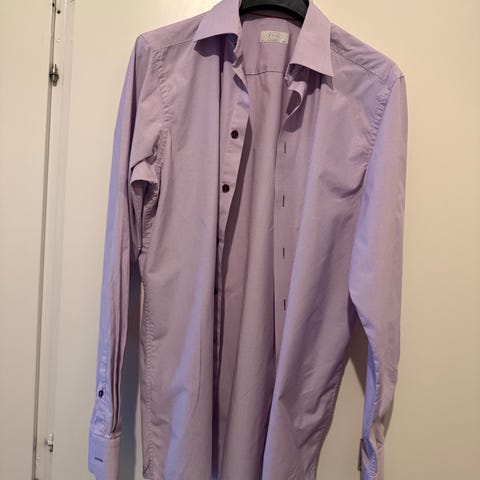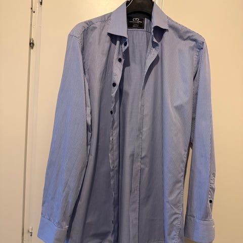 Skjorta med lång ärm och krage. Försluts med knappar framtill och vid ärmslut.