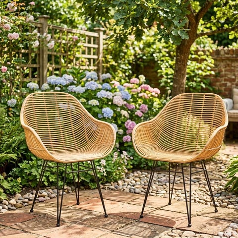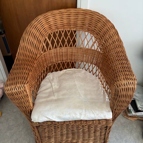 2 charmiga korgstolar i rotting med tillhörande ateljésydda dynor. Gamla men varsamt använda. Helt intakta i rottingen.