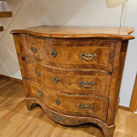 Fin antik byrå i furu med tre lådor och spegel upptill. Två små överdelar med lådor vid spegeln där man kan ställa småsaker. Finns i Furudal.