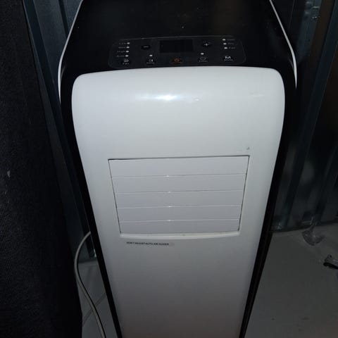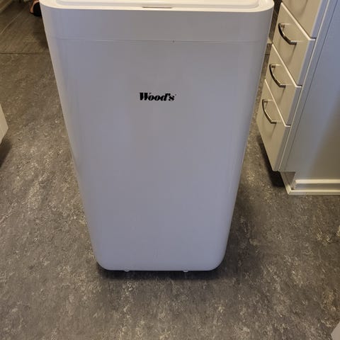 Portabel AC från Woods i vit färg med digital panel upptill och flera knappar för inställningar. Medföljer gör även fönsterlist och slangdelar som syns på bilderna.