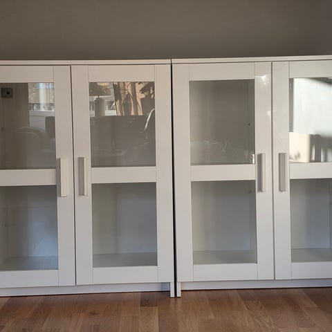 Säljer våra två vitrinskåp / hyllmoduler. De kommer från Jysk och är av modellen Skals. Mått bredd 71 höjd 81/71 cm (avtagbara ben) djup 35 cm. Se bifogad länk för mer info: