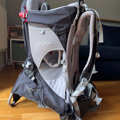Osprey Poco AG Plus bärstol i svart med rejäl ram, vadderade axelremmar och midjebälte. Flera praktiska fickor och remmar samt matchande svart transportväska med axelremmar.