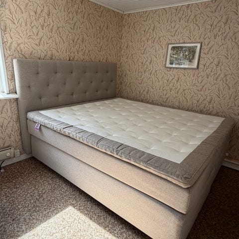 Kontinentalsäng från Viking Beds i grått tyg, ca 160x200 cm med stoppad, knapptuftad sänggavel. Har träramar med ben och en vit bäddmadrass med Viking-tryck på överdraget.