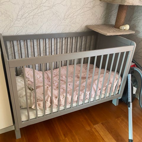 Barnsäng, två lägen att höja och sänka.