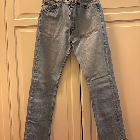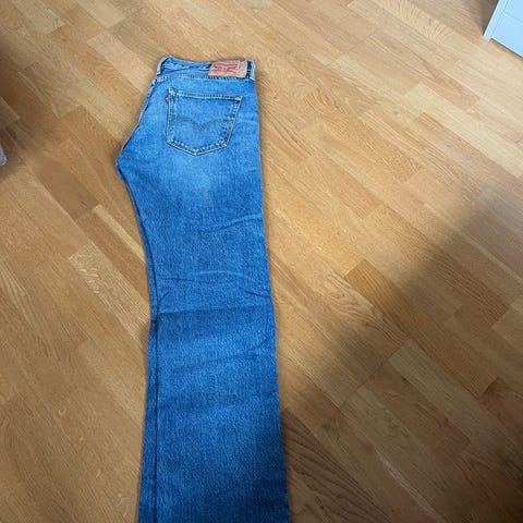 Blå Levi's 501 jeans i denim, dammodell i stl S / W26 L26. Klassisk femficksmodell med knappgylf och läderpatch bak i linningen. Modellen är cropped och därmed kortare i benen. Hög midja. Som nya i skick då de är endast använda några gånger.