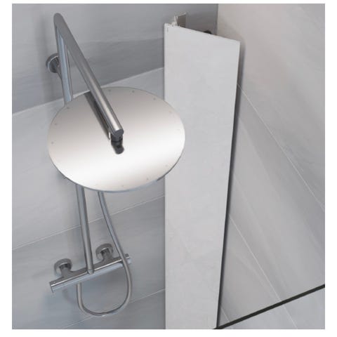 Svart hörnhylla med flera hyllplan i glas och metall. Öppen baksida med stående pinnar och perforerade nederhyllor som ger bra luft runt sakerna.