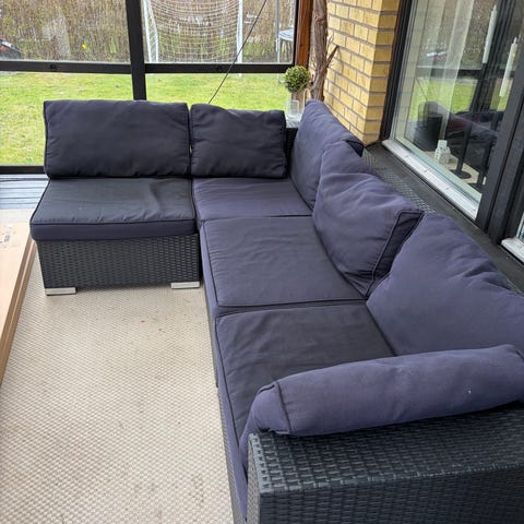 Sofa och bord i konstrotting med grå dynor