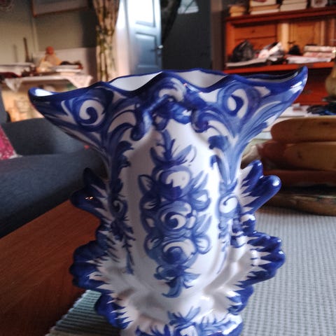 Vit vas med tryck av Mo i Rana-motiv runt om. Smal och hög modell som passar bra på bord eller hylla. Från Mo i Rana i Norge