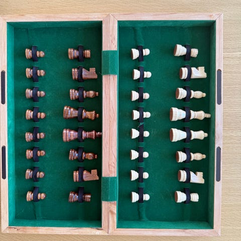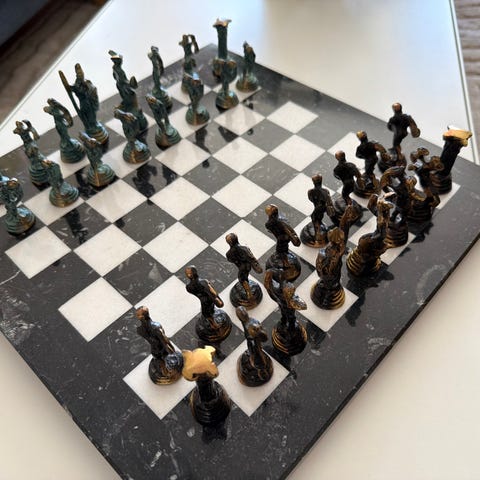 Fint schackspel i marmor med svart och beige spelplan. Från 1900 talet