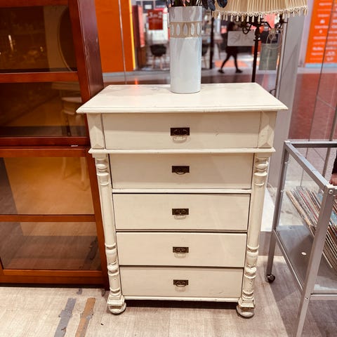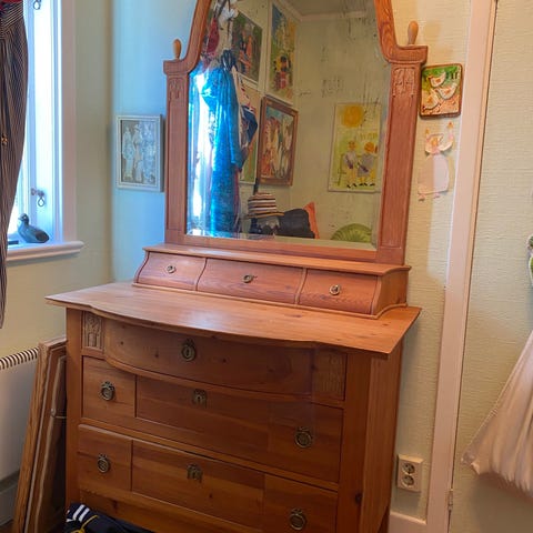 3 lådor som sväljer mycket och 2 småfack uppetill. Nya beslag i gammal stil. En synlig ytskada som inte är djup.