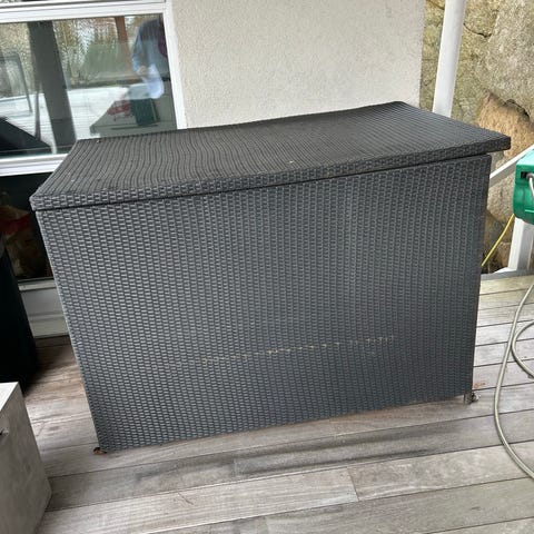 Jag har en dynlåda som inte kommer till nytta. Lite onödigt smutsig på bilden, jag kan tvätta av den innan du kommer och hämtar 😊, men funkar bra att ha ute på altan eller vid huset.
