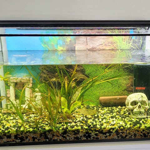 Välvårdat äldre 100 l akvarium (Eheim, 80 x 45 cm) i gott skick (11 år) med lysrör, renare, doppvärmare, timer och inredning (mangrove-rötter, slott, skeppsvrak, skattkista, termometer, viss växtlighet och vacker stenbeläggning ) säljes till akvarievän. Renaren behöver ny svamp och nya sugproppar (ca 450 kr). Även div tillbehör för skötsel ingår (håvar, provtagningskit, salt, växtnäring, slamsugare, weekend-foder). Hämtas på Södermalm/Stockholm.