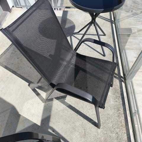 Jysk Radstrup runt utebord, 60 cm i diameter. Svart metall/glas Gott skick.