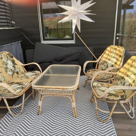 Soffgrupp i konstrotting med ljusa dynor och matchande bord med glasskiva. Soffdelen har armstöd i rotting och inbyggd förvaring under sitsen för t.ex. dynor eller filtar. Har de tjockare dynorna från IKEA Duvholmen och alla dynor är impregnerade. Stått under tak skyddat.