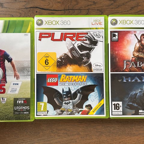Tre Kinect-spel till Xbox 360: Dance Central 2, Kinect Sports Season Two och Kinect Adventures. Fodral med omslag och info på baksidan, alla är PEGI-märkta.