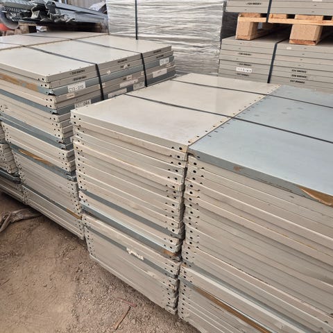 Pall med metallhyllor och perforerade hyllplan säljes. Flera delar och sektioner ligger staplade och klara för montering i lager eller förråd.