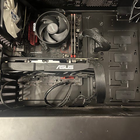 Säljer diverse datorkomponenter monterade i ett svart datorchassi med sidopanel. Moderkort, kylare och fläktar sitter redan på plats.