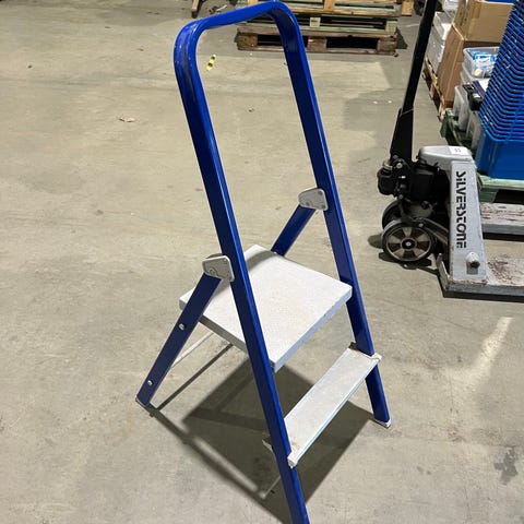 Stadig aluminiumstege med tre steg och stor plattform upptill. Har räcke att hålla i och halkskyddade steg.